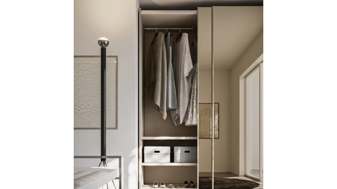La struttura interna è progettata per offrire massima organizzazione: moduli componibili, ripiani regolabili e accessori dedicati permettono di personalizzare lo spazio secondo le proprie esigenze. I materiali selezionati garantiscono robustezza e durata nel tempo, mentre le soluzioni salvaspazio rendono l’armadio adatto anche a camere di dimensioni ridotte.