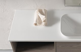 Una tipica composizione Bik prevede una base sospesa con due ampi cassetti orizzontali in nobilitato finitura Laos, impreziositi da maniglie in metallo laccato Champagne. Il top in gres, nella raffinata finitura Fokos Terra, offre una superficie resistente e di grande impatto visivo, su cui sono posizionati due lavabi da incasso soprapiano in ceramica bianco lucido. Questa configurazione non solo ottimizza lo spazio, ma rende anche più semplici le operazioni di pulizia grazie alla sospensione della base. Il sistema di apertura è affidato al profilo BIK, un elemento in alluminio integrato lungo tutta la lunghezza del mobile, caratterizzato da linee raffinate e da una presa inclinata, disponibile sia nella finitura standard Palladio che laccato nei colori opachi Compab.