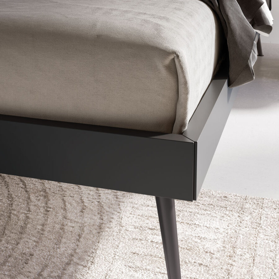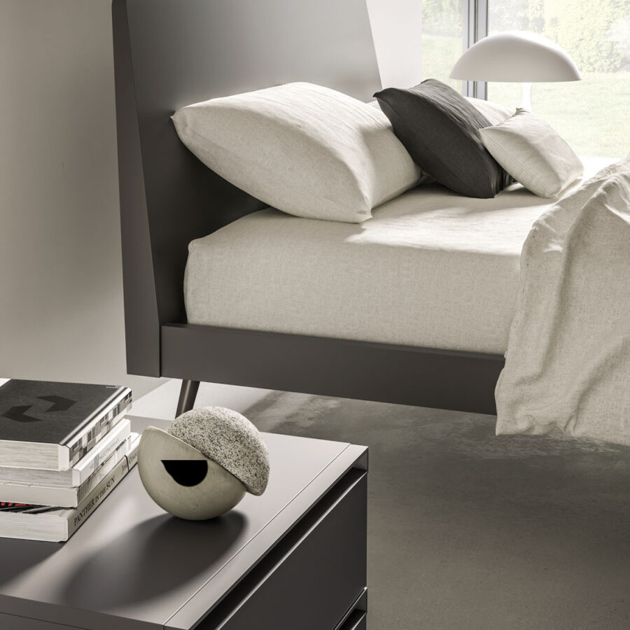 Il letto Olivia di Orme Design è la scelta perfetta per chi desidera un arredo notte moderno ed elegante. La testiera dalle linee pulite e contemporanee si abbina al giroletto Alfa, realizzato in laccato opaco nella raffinata tonalità Tufo, con lavorazione a 45° sugli angoli che dona un dettaglio distintivo e sofisticato. Il piede Metal 1, in metallo brunito dalla forma conica, aggiunge stabilità e un tocco di design industriale alla struttura.