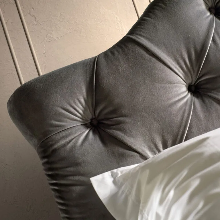 La struttura del letto è realizzata in legno stagionato e agglomerato in classe E1, completamente imbottita per garantire solidità e comfort. L’imbottitura è in poliuretano espanso indeformabile, rivestita in resinato da 300 g e vellutino accoppiato. Questo assicura una sensazione di morbidezza e una lunga durata nel tempo, mantenendo la forma e il sostegno anche dopo anni di utilizzo.