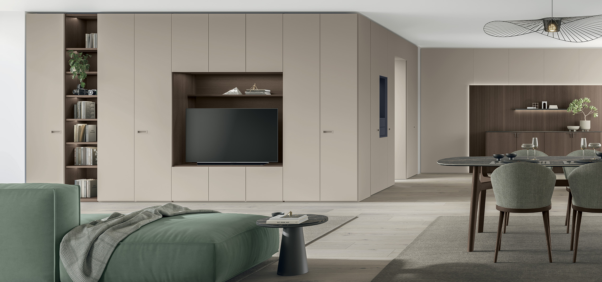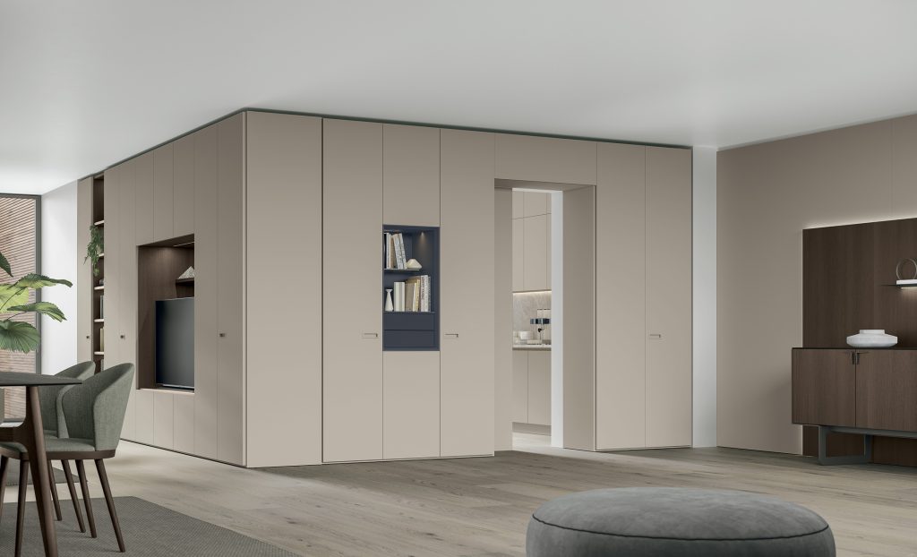 Il Tomasella Logica Plus Unit_03 è una soluzione d’arredo elegante e funzionale, pensata per integrare la zona giorno e l’area pranzo grazie a un’armadiatura ad angolo di grande impatto. La composizione incornicia un vano passante che collega gli ambienti, mantenendo una percezione di spazio aperto e armonico.