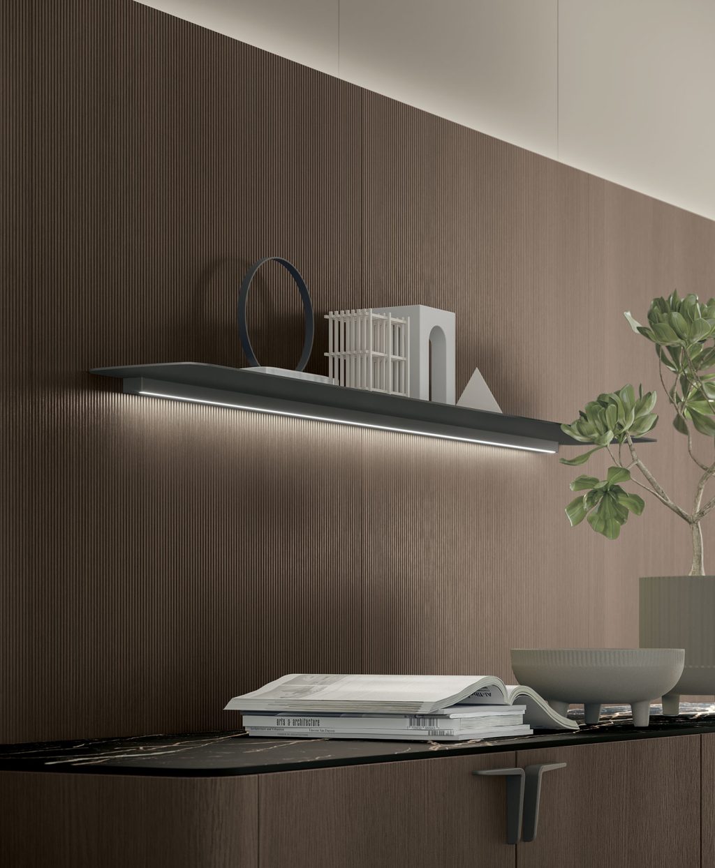 Le dimensioni generose (L 451 cm x P 417 cm x H 255 cm) e le finiture di pregio – materico opaco Arena, Rovere Moka, Traccia Rovere Moka e laccato opaco Blu di Prussia 181 – permettono una personalizzazione completa. La doppia boiserie Glove valorizza la parete retrostante alla madia Pandora, creando raffinati giochi materici e contrasti visivi, con dettagli retroilluminati che esaltano la scena.