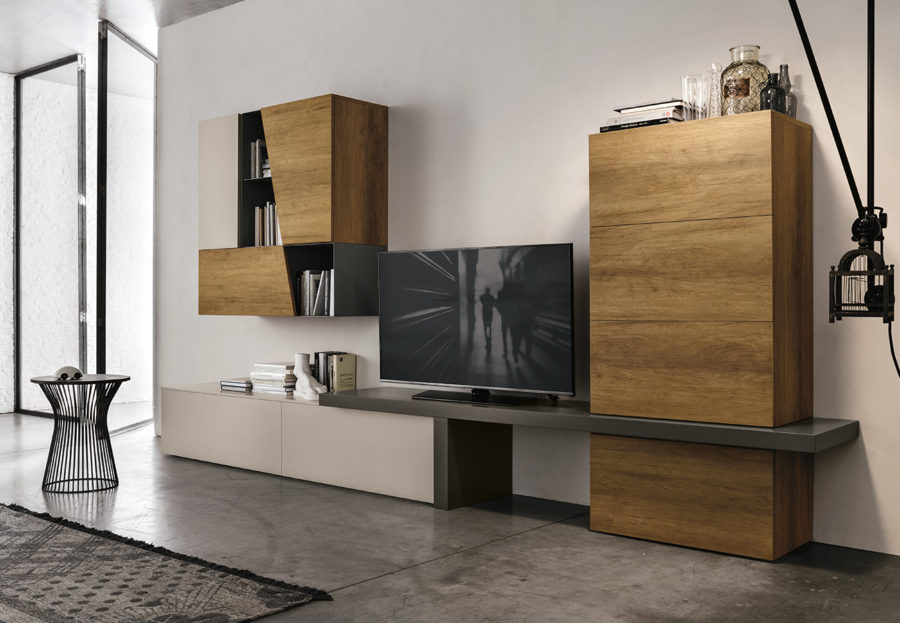 Il design innovativo si esprime attraverso l’alternanza di volumi e materiali: la base porta TV in materico opaco madreperla si abbina armoniosamente al totem in materico nodato chiaro, mentre la panca in laccato opaco smoke 128 aggiunge un tocco di eleganza contemporanea. Il pensile sospeso, realizzato anch’esso in materico opaco madreperla e nodato chiaro, è arricchito da un elemento a giorno in metallo finitura antracite che dona leggerezza visiva e un accento industriale, perfetto per chi ama i contrasti materici e le soluzioni di tendenza.