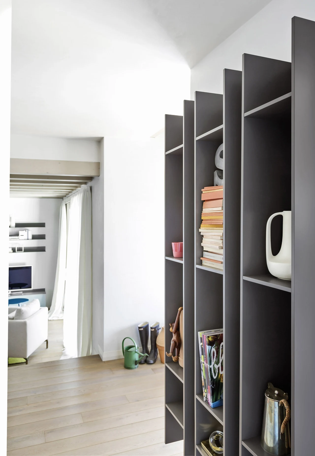 La struttura è realizzata in classe E1 con basse emissioni di formaldeide e proposta in finiture laccate opache (bianco, grigio chiaro, sabbia, quarzo, nero), per abbinamenti puliti con palette neutre o contrasti decisi. Il modulo orizzontale misura indicativamente L 180 × H 24 × P 26 cm; le dimensioni dei comparti e altri formati sono disponibili da listino e scheda tecnica.